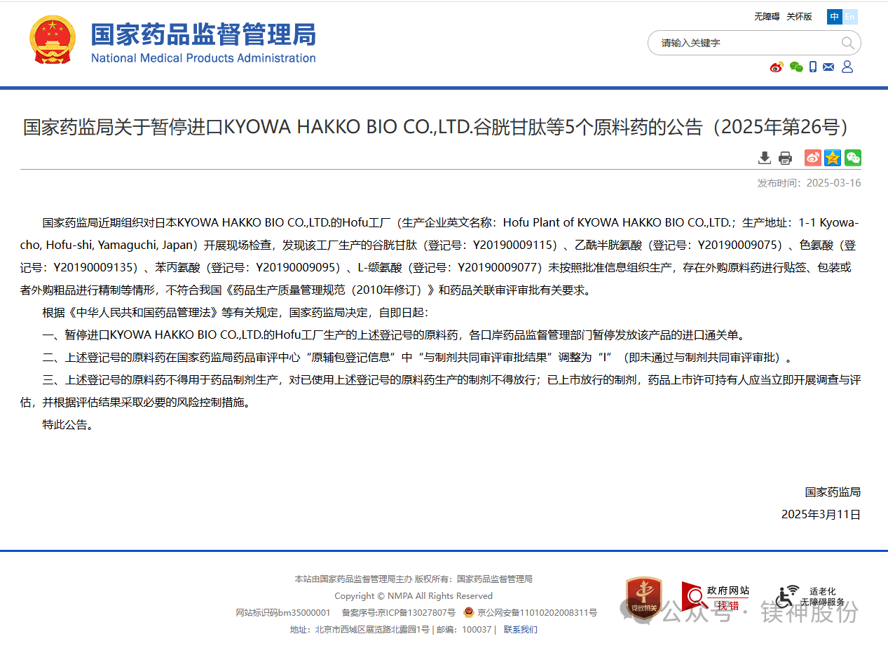 近日,國家藥監局發布重要公告,宣布暫停進口日本KYOWA HAKKO BIO CO.,LTD.(協和發酵株式會社)生產的谷胱甘肽等5個原料藥。這一決定源于該公司的Hofu工廠在生產過程中存在未按批準信息組織生產、外購原料藥進行貼簽、包裝或外購粗品進行精制等嚴重違規行為,不符合我國《藥品生產質量管理規范(2010年修訂)》及相關審評審批要求。為確保藥品安全與質量,國家藥監局已暫停上述原料藥的進口,并對其在藥品制劑中的使用進行了嚴格限制。