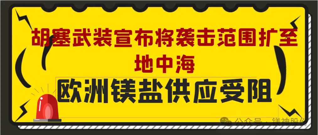 5月3日,胡塞武裝宣布:行動升級,將襲擊范圍擴至地中海,所有向以色列輸送貨物的船只發起襲擊,此次沖突升級后對歐洲鎂鹽供應產生巨大影響。特別是死?;瘜W溴業有限公司(DEAD SEA BROMINE COMPANY LTD),作為全球的鎂鹽供應商之一,此次攻擊導致該區域鎂鹽供應中斷,給多個行業帶來巨大沖擊。