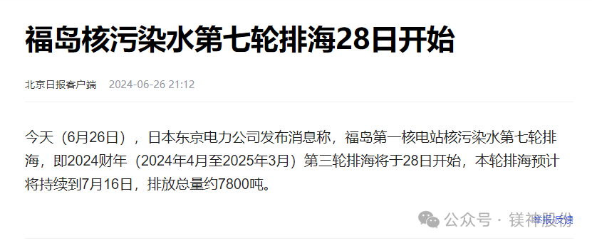 6月26日,日本東京電力公司發布消息稱,福島第一核電站核污染水第七輪排海,即2024財年(2024年4月至2025年3月)第三輪排海將于28日開始,本輪排海預計將持續到7月16日,排放總量約7800噸。